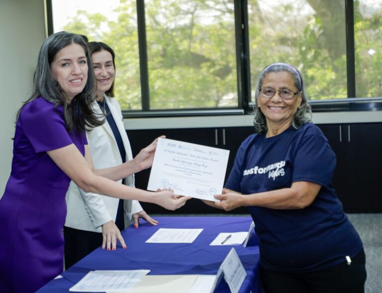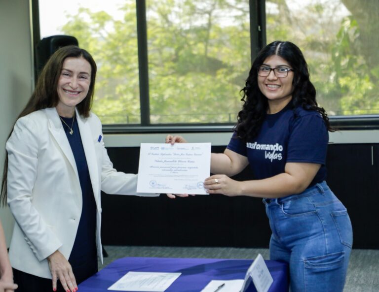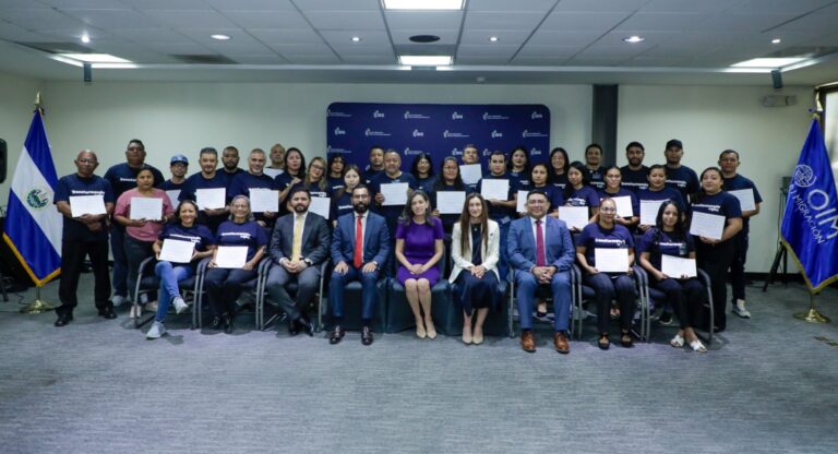 En este evento, la representante interina de la OIM, Irene Vignini, resaltó la importancia de este curso dado a que su enfoque psicosocial permite la reconstrucción de proyectos de vida de las personas retornadas. “Gracias por su compromiso y su empeño de construir su futuro en El Salvador”, destacó la funcionaria de OIM.