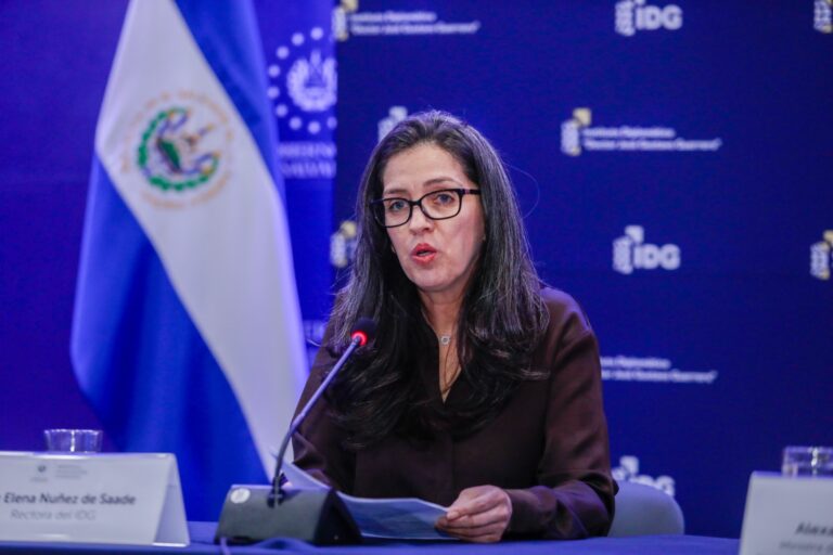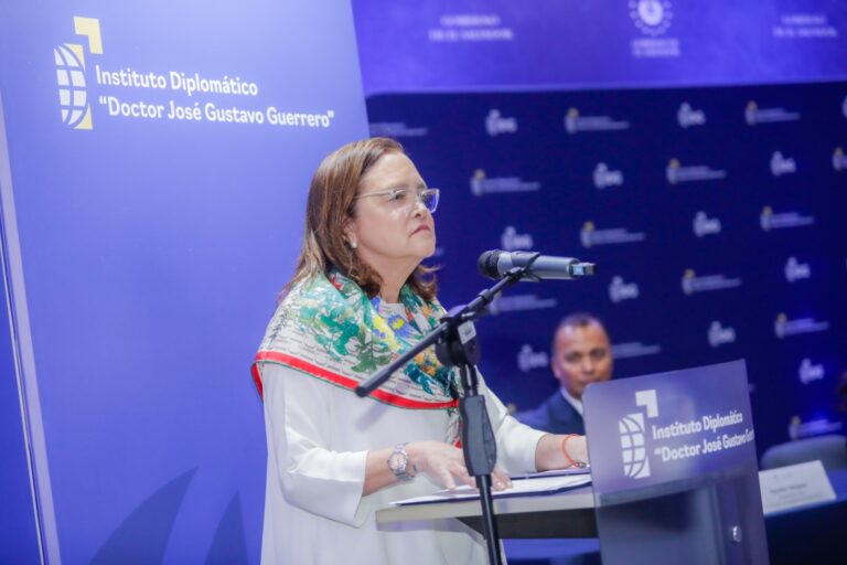 Durante el acto, la ministra Hill resaltó el rol del IDG al formar diplomáticos profesionales, comprometidos y al servicio de la sociedad salvadoreña.