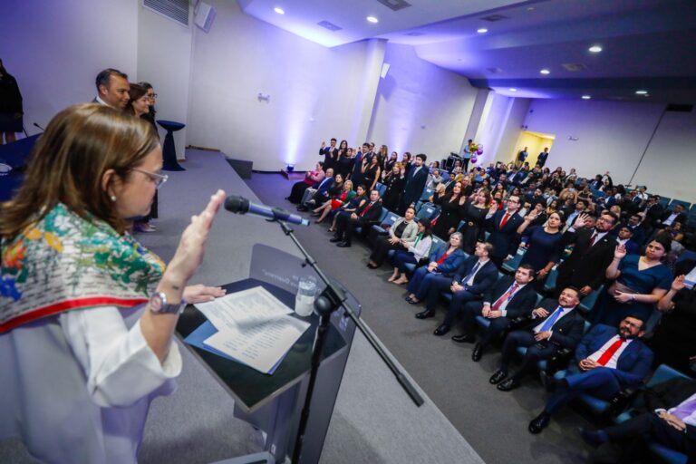 En la ceremonia, la canciller Hill felicitó y juramentó a los 25 nuevos maestros en Diplomacia, quienes cursaron esta carrera durante tres años en sus dos modalidades: virtual y presencial.